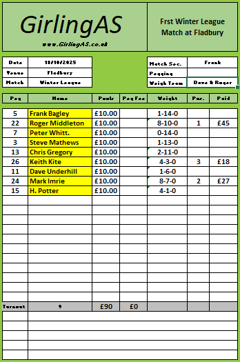 25/10/2026. Droitwich Canal Ombersley Way the second Winter League Match.