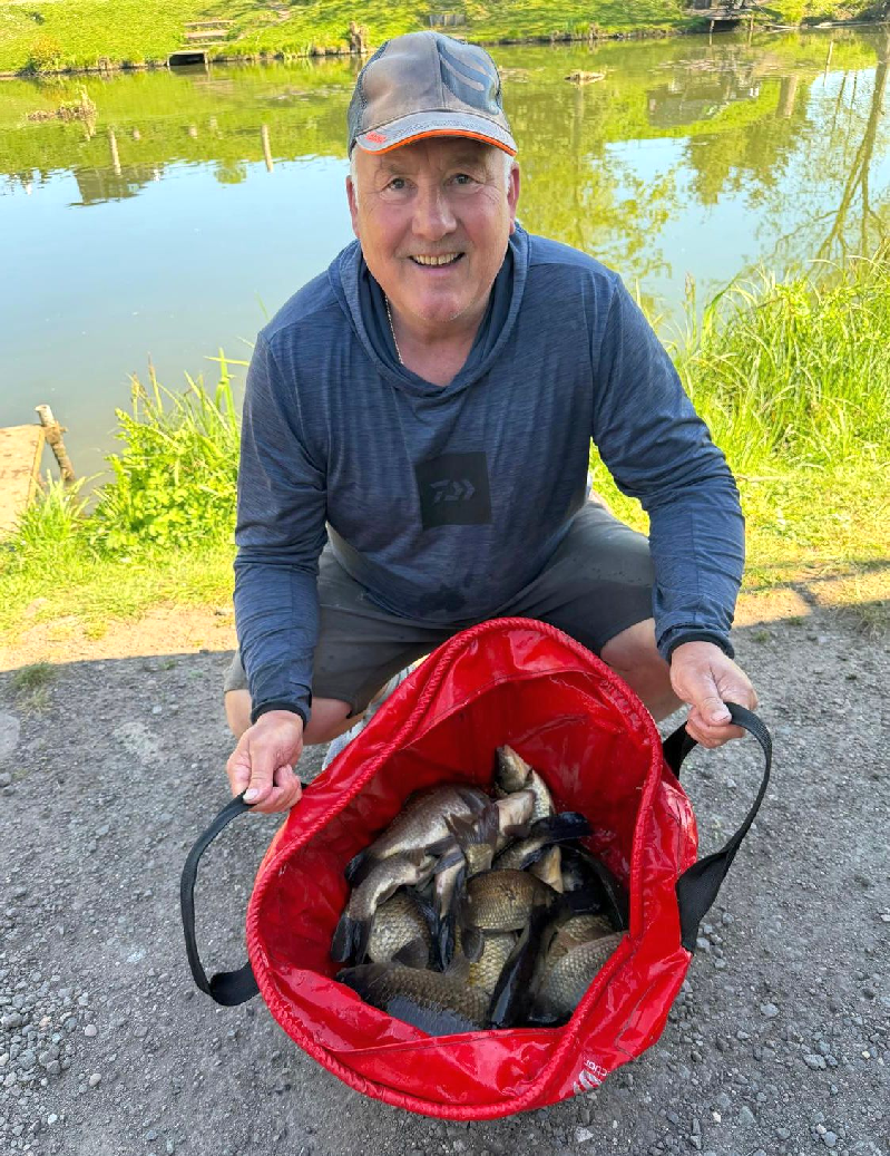 A superb match, everyone was on fish & we weighed in over 450lb of Carp. Glen won convincingly catching over shotted down the margin on Maggot. There were fish everywhere on peg 1, Frank caught into the scummy right corner on banded pellet, with fish cruising around all day. Mainly stockies but bigger fish in the last hour. Stephen next to the winner also caught down the margin. A superb summer match.