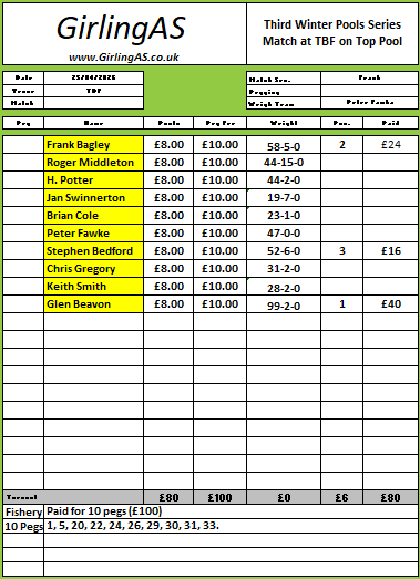 30/5/2026 The fourth Winter pools Match at Solhampton on Jackdaw Pool
